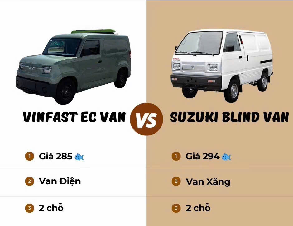 Trong phân khúc này, hai cái tên nổi bật nhất chính là VinFast ECVan – mẫu xe điện thương mại đầu tiên của Việt Nam, và Suzuki Van (Super Carry) – “huyền thoại” đã thống trị suốt hơn 20 năm.